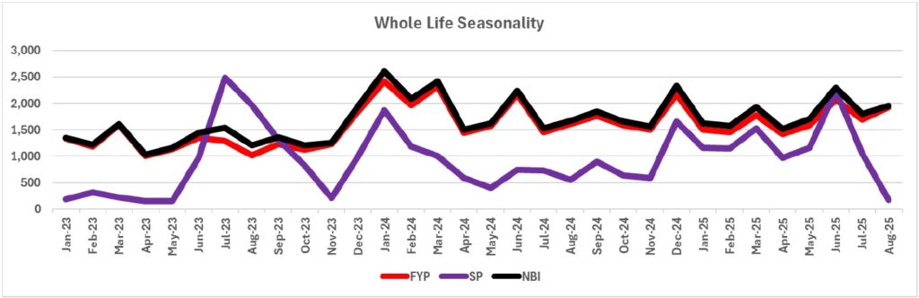 - Massive spikes every December which I would expect to reflect the sales of products designed to maximize the customer’s Life Insurance Tax relief.