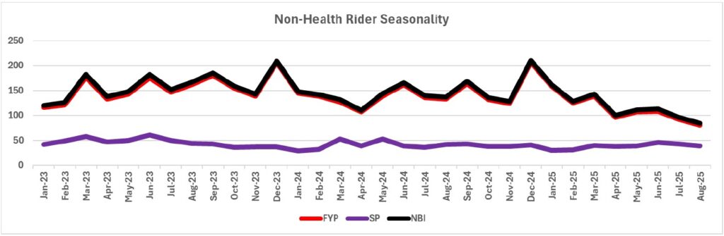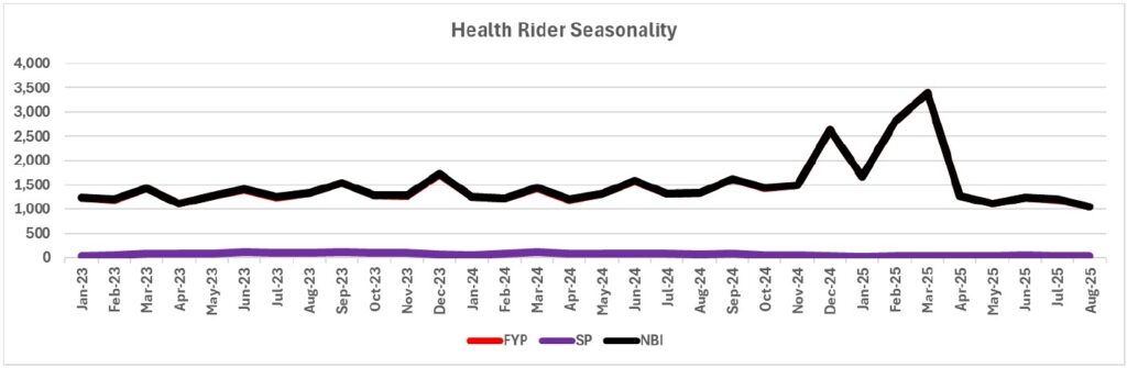 - Non-Health Riders ranks #8 the lowest for NBI at 1.4% of the total NBI for the Industry for the months reviewed.